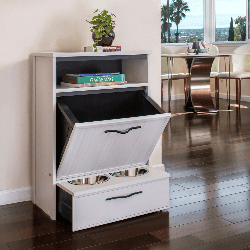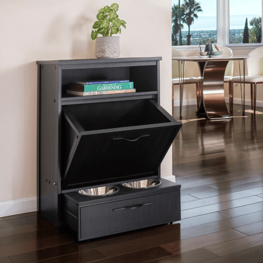 En la parte media se encuentra el compartimento de almacenamiento integrado que permite guardar fácilmente el alimento de tu mascota, manteniéndolo fresco y a mano para cada comida. Capacidad aproximada para 10kgs de pienso.