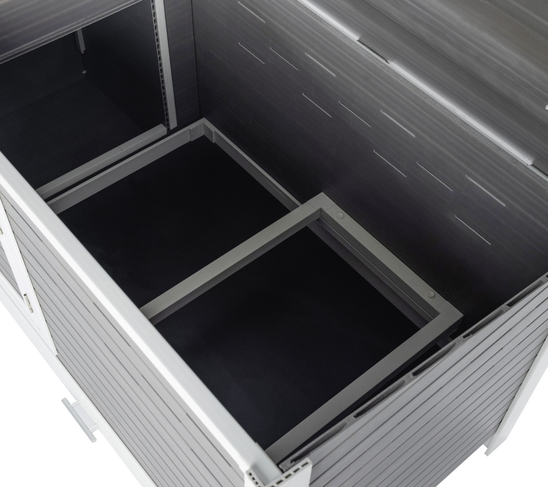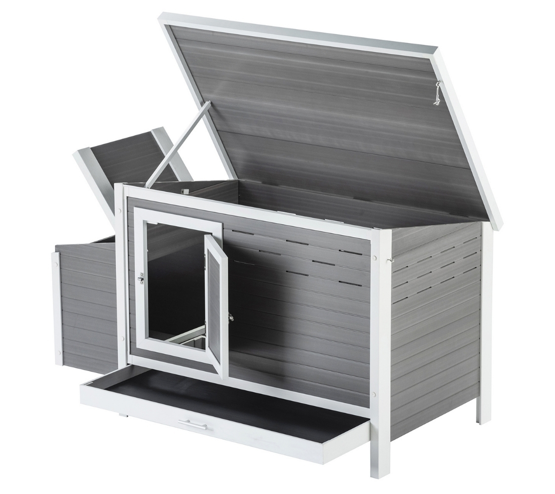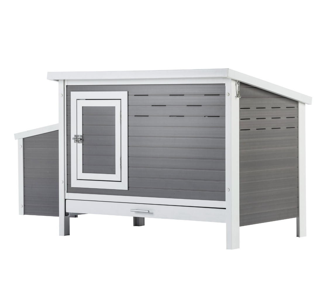 Fabricado con ECOFLEX®, un material patentado compuesto de polímeros reciclados y fibras de madera. Las fibras naturales ayudan a proporcionar aislamiento térmico, mientras que los polímeros aportan resistencia y durabilidad. A diferencia de los gallineros de madera tradicionales, este material no se pudre ni se agrieta con el paso del tiempo, ofreciendo una vida útil más larga y un mantenimiento mínimo.