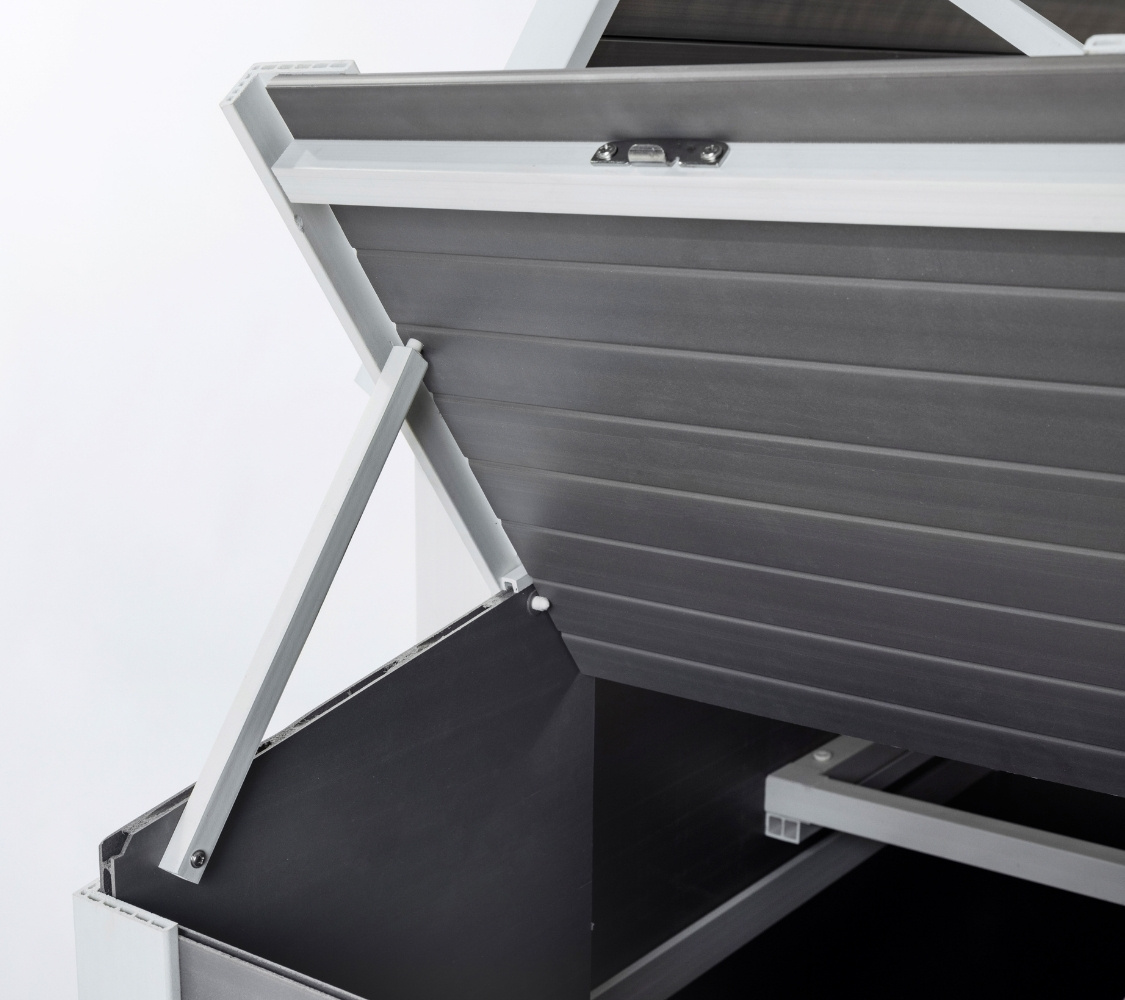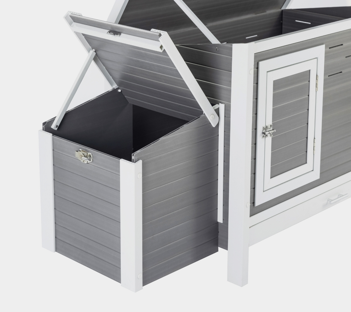 Cuenta con un ponedero exterior de dos compartimentos, al que las gallinas acceden desde el interior del gallinero. El tejado del ponedero es abatible, lo que permite recoger los huevos cómodamente desde el exterior sin molestar a las gallinas.