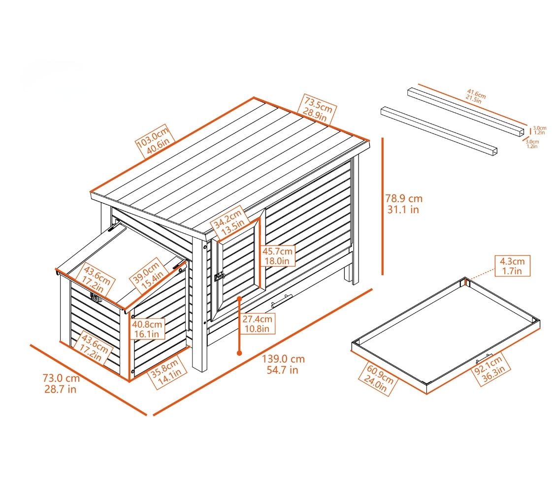 El gallinero está ligeramente elevado del suelo para evitar el contacto directo con la humedad y el frío. La puerta frontal se abre convirtiéndose en rampa, lo que facilita el acceso de las gallinas al interior. En su interior dispone de perchas para el descanso, permitiendo que las aves se acomoden de forma natural durante la noche.