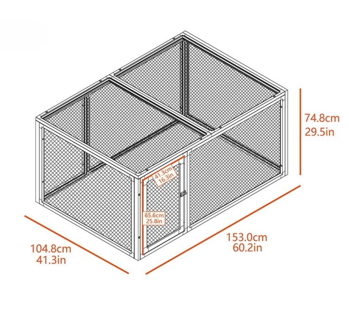 Está disponible en dos tamaños. El tamaño pequeño está pensado para acoplarse al gallinero Dallas, mientras que el tamaño grande es compatible con el gallinero Durango, permitiendo ampliar considerablemente el espacio exterior disponible para las gallinas.