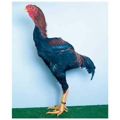 La raza Combatiente Malayo procede de India y Malasia, aunque fue perfeccionada en Europa. Es un ave grande, esbelta y musculosa. El cuello, el pecho y las patas forman une línea casi vertical. El plumaje es corto, ceñido y tieso. Los tarsos son amarillos. No es una raza especialmente ponedora, pero su carne es abundante. El gallo puede llegar a pesar 4,5 kg y la gallina 3,5 kg.